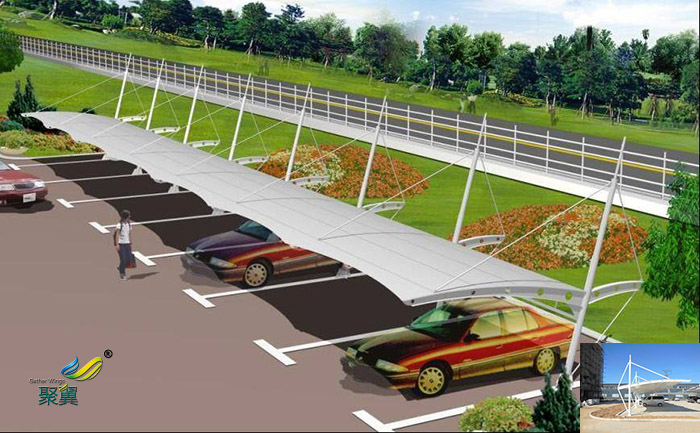 膜結(jié)構(gòu)停車棚特點二:觀賞性;這個是它特別的一個特點,可以說它不僅僅只是人們用來停車的一個地方,更是一個城市的門面,所以這種材料制成的停車棚就具有他獨到的觀賞性,在有些城市中看見它你甚至?xí)詾槟鞘且患囆g(shù)品,不會將它和停車棚聯(lián)系在一起的,而且它的造型是非常多的,這也是現(xiàn)在的人們喜歡它的一個原因。