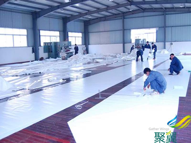膜布制作設(shè)計是指導(dǎo)膜布的裁剪設(shè)計,膜布裁剪需要專業(yè)設(shè)計師精確運算得出膜布的最節(jié)省的裁剪方案,膜布的門幅有2.5\3.0\3.5等根據(jù)不同膜布造型選擇最節(jié)省膜布的設(shè)計裁剪圖,減小損耗降低成本,方便安裝縮減膜結(jié)構(gòu)的制作工期!之后轉(zhuǎn)交膜布裁剪部依裁剪圖精確剪裁所需膜布形狀大小后,送交焊接部焊接制作,經(jīng)過高頻熱合機(jī)焊接成型后送檢測部,經(jīng)檢測合格后送交包裝部打包,制作完成后發(fā)貨,安裝!