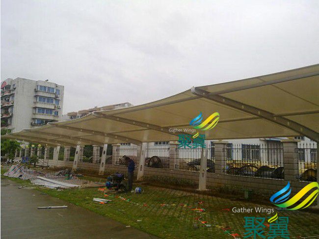 車棚材料選用了進口結(jié)構(gòu)建筑材料。車棚骨架,表面處理采用進口船用底漆。膜結(jié)構(gòu)是由多種高強薄膜材料(PVC或Teflon)及加強構(gòu)件(鋼架、鋼柱或