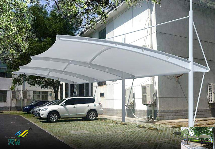 膜結構車棚按其結構形式可分為鋼結構、張拉結構及充氣結構;按膜材特性又可分為長時間性膜結構(膜材使用年限可超過25年)、短時間性膜結構(膜材使用年限為10-15年)及臨時性膜結構(膜材使用年限為3-5年);按膜材成分又可分為PVDF膜材、PTFE膜材及ETFE膜材。