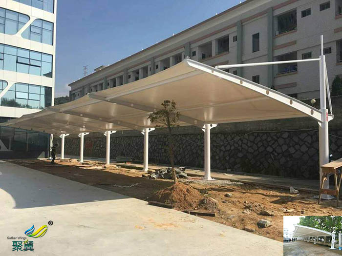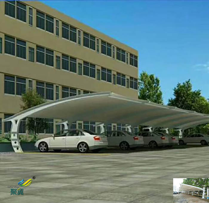 膜結(jié)構(gòu)車棚是由多種高強(qiáng)薄膜材料及加強(qiáng)構(gòu)件(鋼架、鋼柱或鋼索)通過(guò)一定方式使其內(nèi)部產(chǎn)生一定的預(yù)張應(yīng)力以形成某種空間形狀,作為覆蓋結(jié)構(gòu),并能承受一定的外荷載作用的一種空間結(jié)構(gòu)形式。膜結(jié)構(gòu)車棚的篷布采用PVC/PVDF/PTFE/ETFE,而膜材的特點(diǎn)是強(qiáng)度高、耐久性好、防火難燃、自潔性好,不受紫外線影響,使用壽命長(zhǎng),一般15-30年。具有高透光率,透光率為13%,對(duì)熱能反射率73%,熱吸收量很少。正是因?yàn)檫@種劃時(shí)代的膜材料的發(fā)明,使膜結(jié)構(gòu)車棚成為現(xiàn)代化的永久建筑。