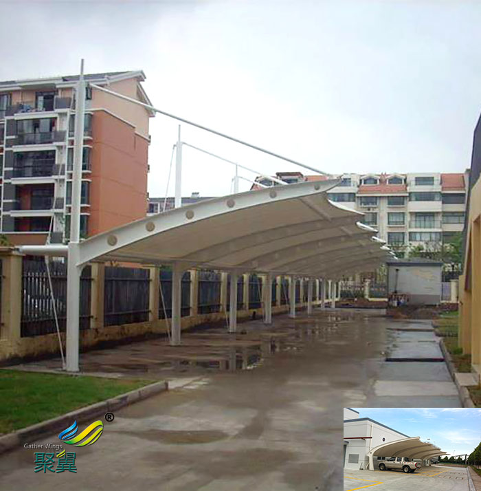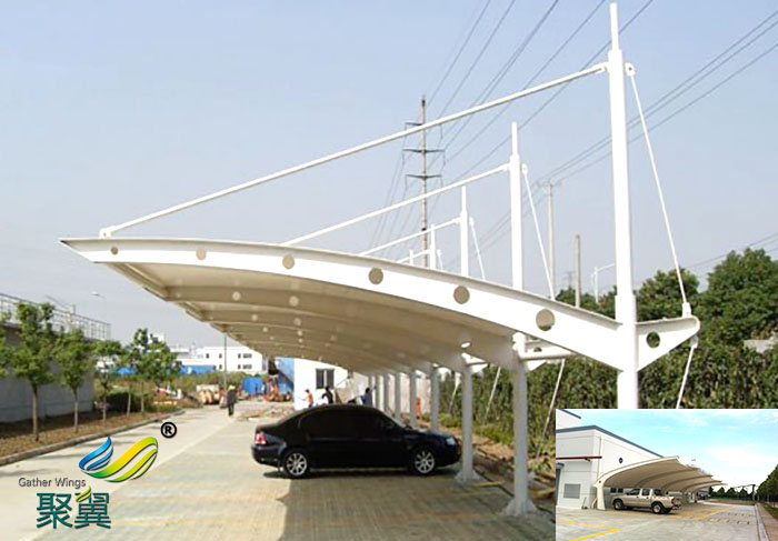 膜結(jié)構(gòu)停車棚本身是依靠膜自身的張拉應(yīng)力與支撐桿和拉索共同構(gòu)成的體系,此結(jié)構(gòu)特別適合用來建造城市標(biāo)志性建筑物,如體育與娛樂性場館,廣告效應(yīng)的商場、餐廳、城市的命脈的關(guān)鍵性建筑,這時(shí)新型膜材用于此可以體現(xiàn)出更好的益處。