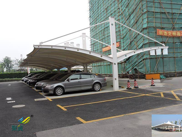 膜結(jié)構(gòu)車棚,是以建筑織物,即膜材料為張拉主體,與支撐構(gòu)件或拉索共同組成的結(jié)構(gòu)體系,它以其新穎獨(dú)特的建筑造型,良好的受力特點(diǎn)——成為大跨度空間結(jié)構(gòu)的主要形式之一。膜材料是指聚酯纖維基布或PVDF、PVF、PTFE等不同的表面涂層,配以優(yōu)質(zhì)的PVC組成的具有穩(wěn)定的形態(tài),并可承受一定載荷的建筑紡織品。它的壽命因不同的表面涂層而異,一般可達(dá)成10-20年。