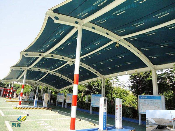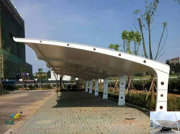 膜結(jié)構(gòu)車棚的篷布材質(zhì)是膜結(jié)構(gòu),而膜材的最大特點(diǎn)是強(qiáng)度高、耐久性好、防火難燃、自潔性好,不受紫外線影響,使用壽命長,一般15-30年。具有高透光率,透光率為13%,對熱能反射率73%,熱吸收量很少。正是因為這種劃時代的膜材料的發(fā)明,使膜結(jié)構(gòu)車棚成為現(xiàn)代化的永久建筑。鑒與此,膜結(jié)構(gòu)造型的停車棚在停車場建設(shè)中也以其優(yōu)美的造型和實在的功能擔(dān)當(dāng)重要角色,是您的愛車最佳安身之所。