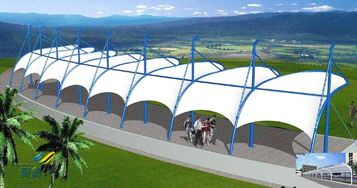 膜結(jié)構(gòu)車棚一改傳統(tǒng)建筑材料而使用膜材,其重量只是傳統(tǒng)建筑的三分之一,而且膜結(jié)構(gòu)車棚可以從根本上克服傳統(tǒng)大跨度建筑上所遇到的困難,可創(chuàng)造巨大的無遮擋的可視空間。膜結(jié)構(gòu)車棚特點(diǎn)是強(qiáng)度高、耐久性好、防火難燃、透光性好、自潔性好,跨度可以超過兩百米,不受紫外線影響,使用壽命長,一般15-30年。