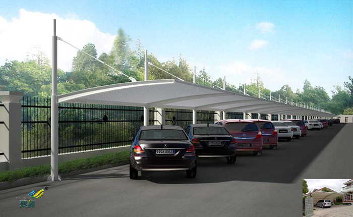車棚是一種預應力空間整體結構,將結構與建筑圍合部分結為一體,最大限度的發(fā)揮了膜材料的承載能力,創(chuàng)造出一種具有自然形態(tài)美的外觀,既飄逸又剛勁有力。膜材對光反射高吸收低,且熱傳導性較低,這極大程度上阻止紫外線進入室內。另外,膜材料的半透明性保證了適當?shù)穆涔庹彰魇覂?,進行自然采光,節(jié)約運營中的能源消耗,但嚴寒地區(qū)宜進行必要的保溫設計。車棚奇特的造型和夜景效果有明顯的建筑可識性和商業(yè)效應。膜結構車棚的膜材、鋼結構支承系統(tǒng)均可在工廠內制作,現(xiàn)場安裝,便于工業(yè)化,縮短施工工期,具有良好的經濟性。相比傳統(tǒng)的停車棚,膜結構車棚具有自潔性好、大跨度、造型美觀、施工周期短、體量輕等優(yōu)點,目前已經得到廣泛應用。