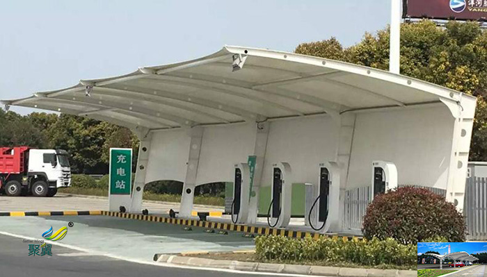 1.膜結(jié)構(gòu)汽車棚具有藝術(shù)性,除了一般的雨篷具有不可比擬的使用價值,且比較耐用,具有遮風(fēng)擋雨的效果,不僅如此,還給人以審美享受。它本身具有柔軟的曲線效果,并且可以柔軟靈活,形狀豐富,使用起來非常方便。充電樁雨棚