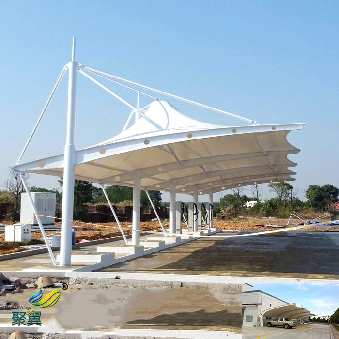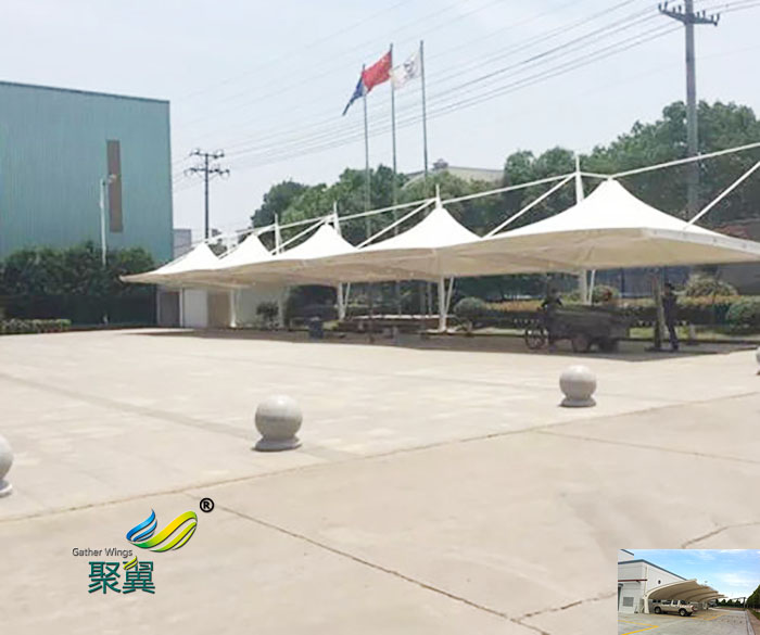 1、帽口膜結(jié)構(gòu)車棚有利排雨排雪功能,頂部拉索結(jié)構(gòu)增加建筑藝術(shù)感,造型時尚美觀。