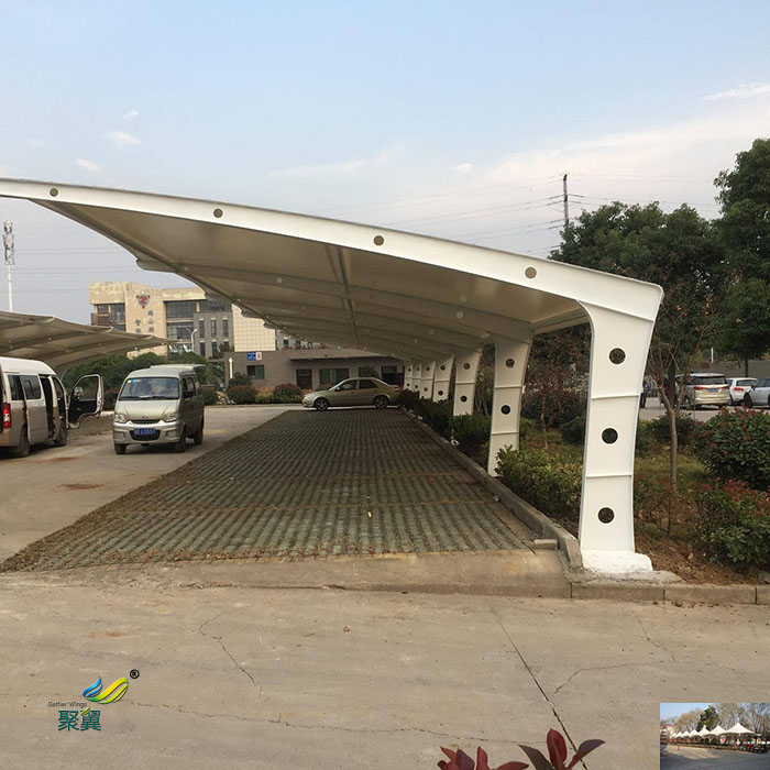 2、膜結(jié)構(gòu)停車棚外表有防紫外線的共擠層,可防止太陽紫外線引起的樹脂疲憊變黃。
