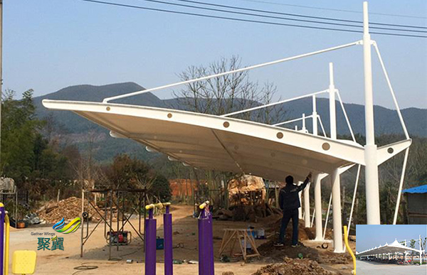 膜結(jié)構車棚其實是有多種的高強薄膜材料和加強構件(鋼架、鋼柱或鋼索)通過一定方式使其內(nèi)部產(chǎn)生一定的預張應力以形成某種空間形狀,作為覆蓋結(jié)構并可以承受一定的外荷載作用的一種空間結(jié)構的形式。