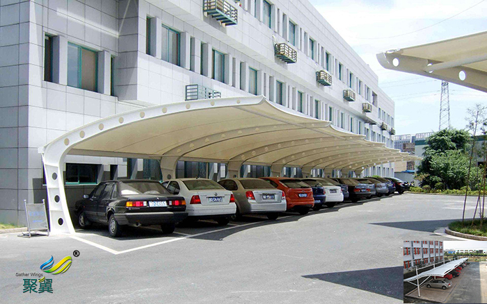 膜結(jié)構(gòu)車棚是現(xiàn)代大跨度空間結(jié)構(gòu)停車場(chǎng)的主要建設(shè)形式之一,具有自身重量輕、受力良好、造型別致等特點(diǎn)。這種結(jié)構(gòu)除了能滿足防風(fēng)雨、防日曬等基本功能外,還有較好的標(biāo)識(shí)招攬效果。