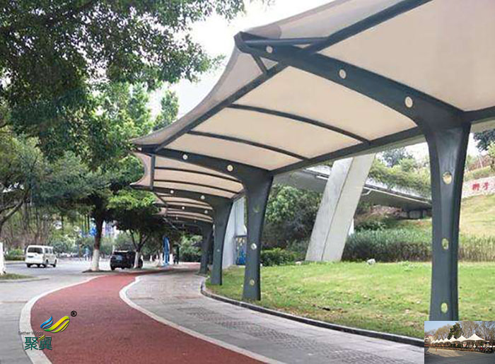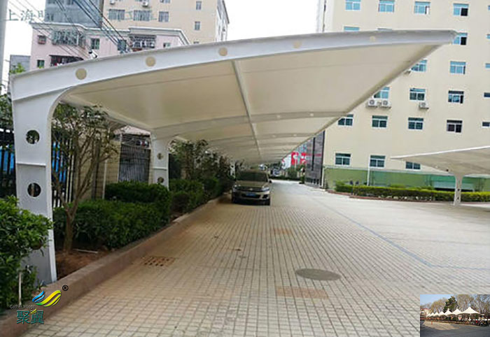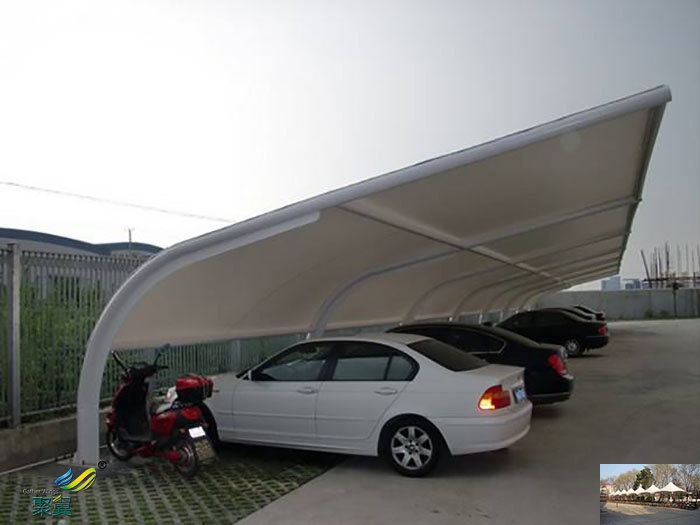 膜結(jié)構(gòu)已被廣泛用于各種功能的車棚。膜結(jié)構(gòu)是一種帶有有機涂層的鋼板,具有耐蝕性好,色彩鮮艷,外觀美觀,加工成型方便及具有鋼板原有的強度等優(yōu)點而且成本較低的特點。