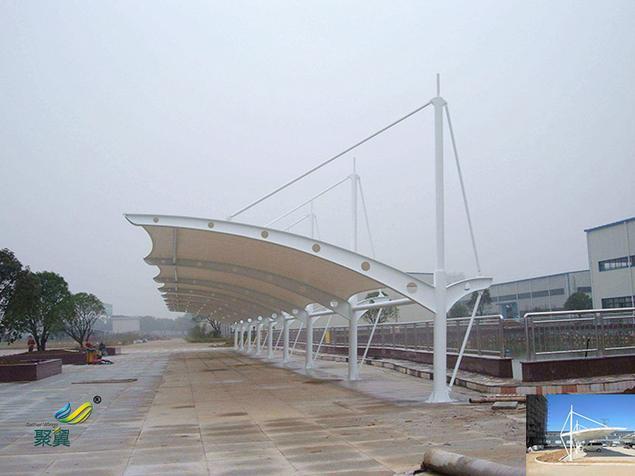 隨著膜結(jié)構(gòu)技術(shù)的不斷進(jìn)步,高強(qiáng)度膜材被研發(fā)出來,再加上張拉技術(shù)的應(yīng)用,使膜結(jié)構(gòu)車棚抵御風(fēng)雨的能力是一般雨蓬之類不可比擬的。有的車棚采用永久性膜材,可使用三、四十年。特別是遇到劇烈的暴風(fēng)雨天氣,膜結(jié)構(gòu)建筑巍然不動(dòng),毫發(fā)不損。