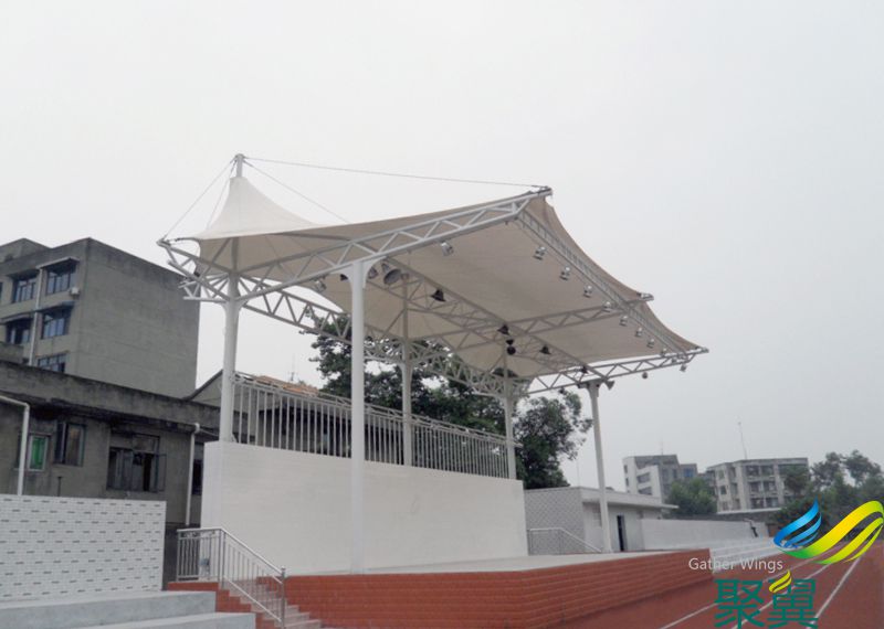 學(xué)校體育看臺(tái)雨棚特點(diǎn)二、實(shí)用性:學(xué)校露天體育操場(chǎng)藍(lán)球場(chǎng)看臺(tái)膜結(jié)構(gòu)雨棚,主要用于體育看臺(tái)遮陽(yáng)防雨。采用膜布為遮陽(yáng)面料的看臺(tái)雨棚《看臺(tái)膜結(jié)構(gòu)》有效果阻擋80%以上的紫外線。由于膜布原基布結(jié)構(gòu)緊密及表面PVDF涂層的保護(hù),拉力可達(dá)到3000n,使用壽命8年-30年之間。是一般遮陽(yáng)面料所不及的!