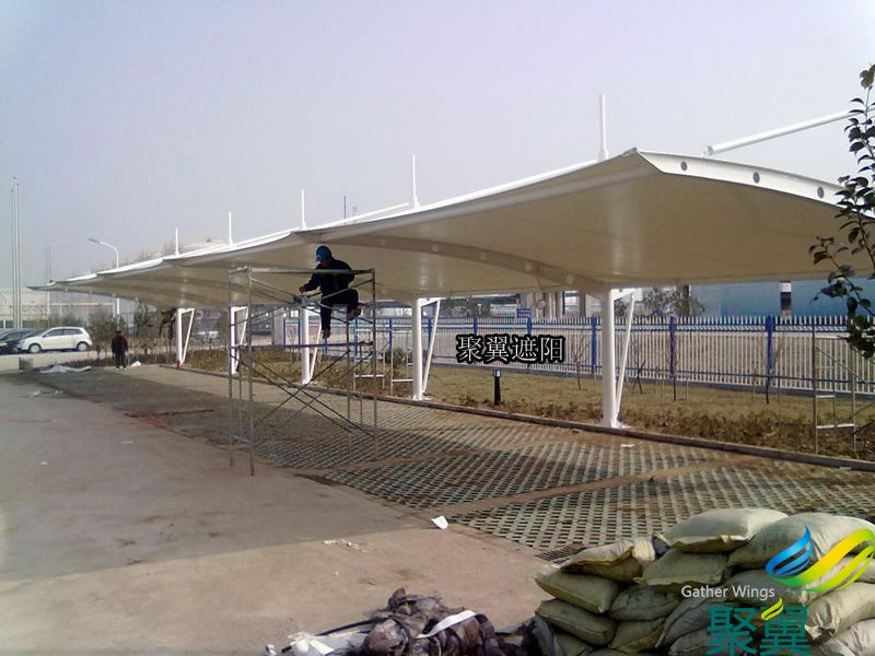 詳細(xì)>>膜結(jié)構(gòu)車棚規(guī)格:立柱高2.6米 , 伸出長7.8米。特殊尺寸可訂制。膜結(jié)構(gòu)車棚作用:具有遮陽、擋...