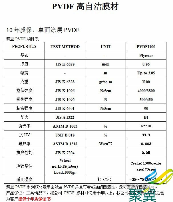 詳細(xì)>>國產(chǎn)PVDF膜材料是指在聚脂纖維編織的基布上涂覆PVC(聚氯乙烯)后再加版100%PVDF(聚偏氟乙烯)...
