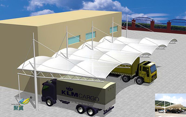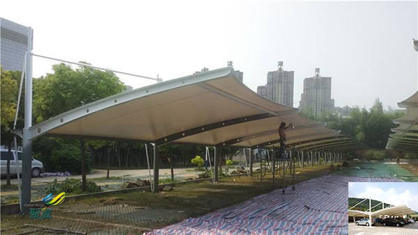 膜結(jié)構(gòu)停車棚耐用:由于高強(qiáng)度的出現(xiàn),再加上張拉技術(shù)的應(yīng)用,使膜結(jié)構(gòu)車棚抵御風(fēng)雨的能力是一般雨蓬之類不可比擬的。有的車棚采用永久性膜材,可使用三、四十年。特別是遇到劇烈的暴風(fēng)雨天氣,膜結(jié)構(gòu)建筑巍然不動,毫發(fā)不損。
