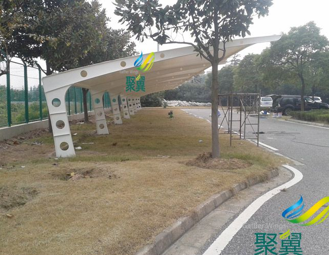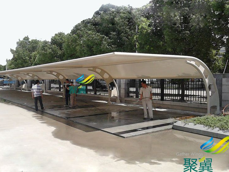 汽車遮陽棚鋼材選用:Q235熱鍍鋅高強(qiáng)度優(yōu)質(zhì)鋼材,拋丸防銹處理,表面噴漆,熱鍍鋅螺栓;鋼構(gòu)工藝流程包含基層處理—涂防銹漆—刮膩子—涂磷化底漆等。汽車遮陽棚的尺寸,伸展長度為:6.5米,立柱間距為5米。