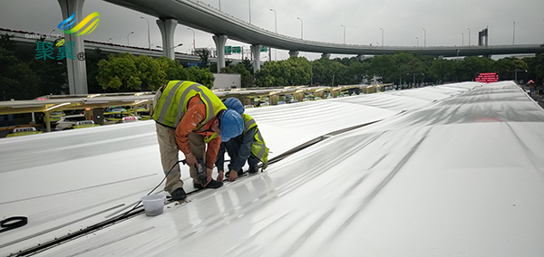 膜結(jié)構(gòu)車棚主體采用加強(qiáng)型鍍鋅鋼結(jié)構(gòu),環(huán)氧富鋅底面油漆。車棚面料采聚翼PVDF膜布材質(zhì)保10年,自潔性能好,進(jìn)口技術(shù)中國(guó)自主生產(chǎn)PVDF膜布材料其表面無靜電,對(duì)灰塵沒有吸附力,長(zhǎng)期用于室外浮灰可利用自然力量(風(fēng)、雨)除去。從而使得膜結(jié)構(gòu)建筑保持表面亮麗潔白,室外使用壽命約為12年。
