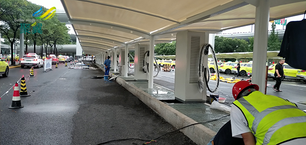 上海虹橋機(jī)場(chǎng)出租車膜結(jié)構(gòu)充電樁車棚安裝現(xiàn)場(chǎng)