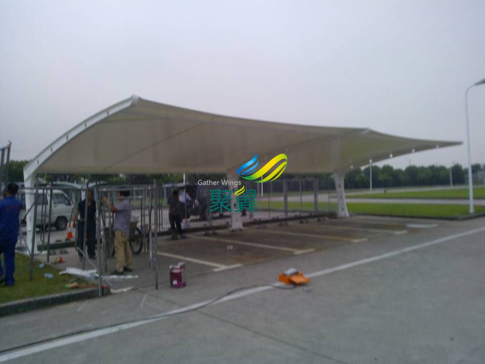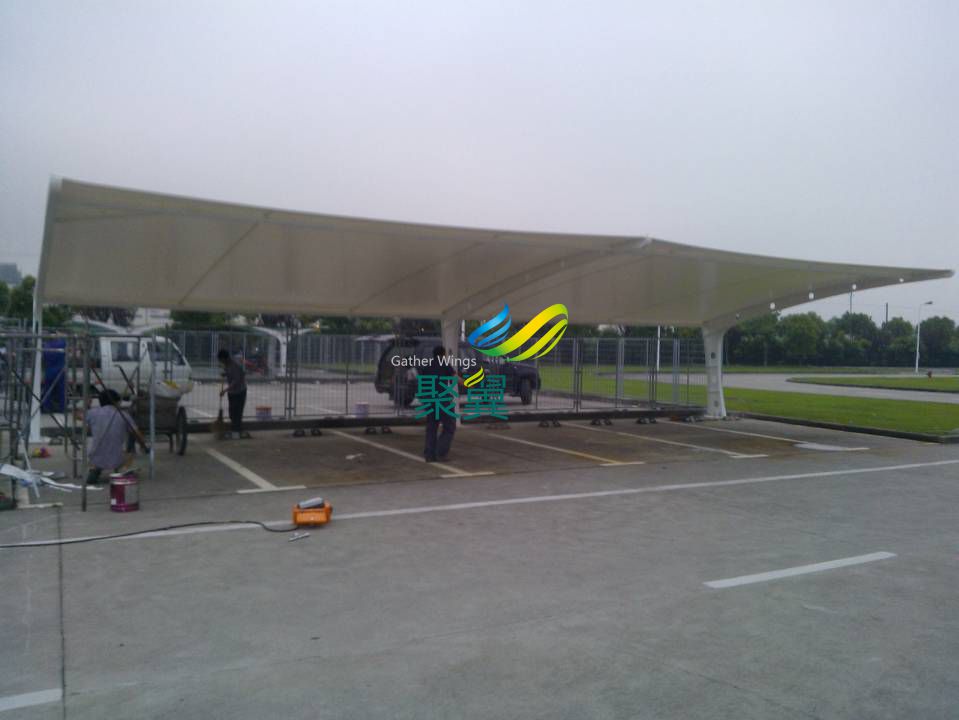 青浦工業(yè)園廠區(qū)膜結構車棚長30米,挑梁挑出去6米,車棚款式多樣,根據(jù)現(xiàn)場尺寸量身定制。遮陽效果好,防水防火安全穩(wěn)定性強!聚翼膜結構車棚加工廠全國配貨安裝,產(chǎn)品多樣化款式及材料方案。