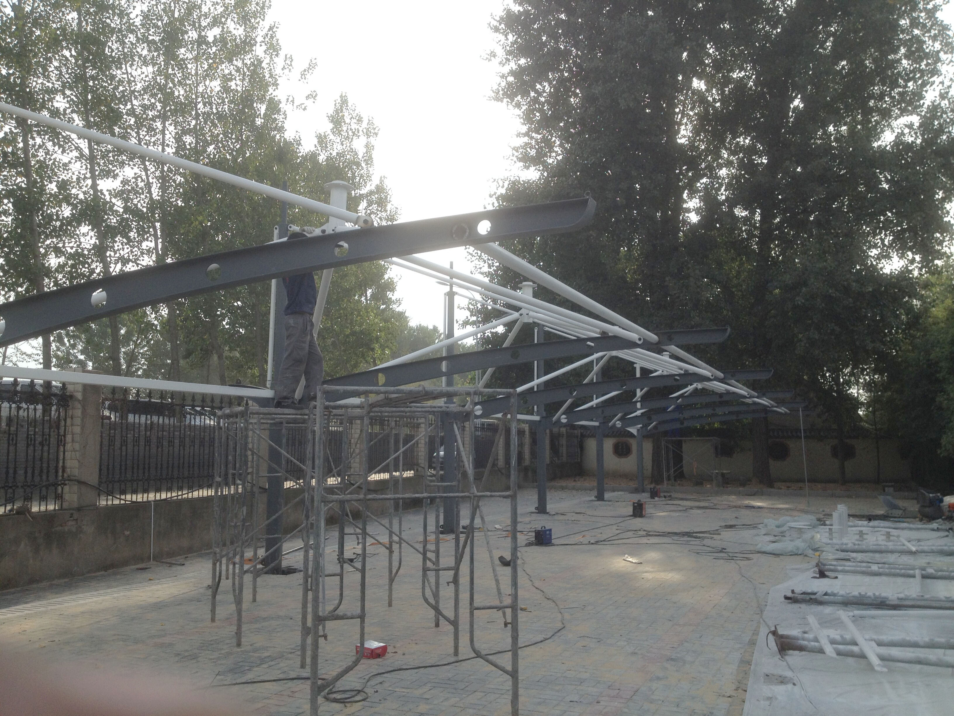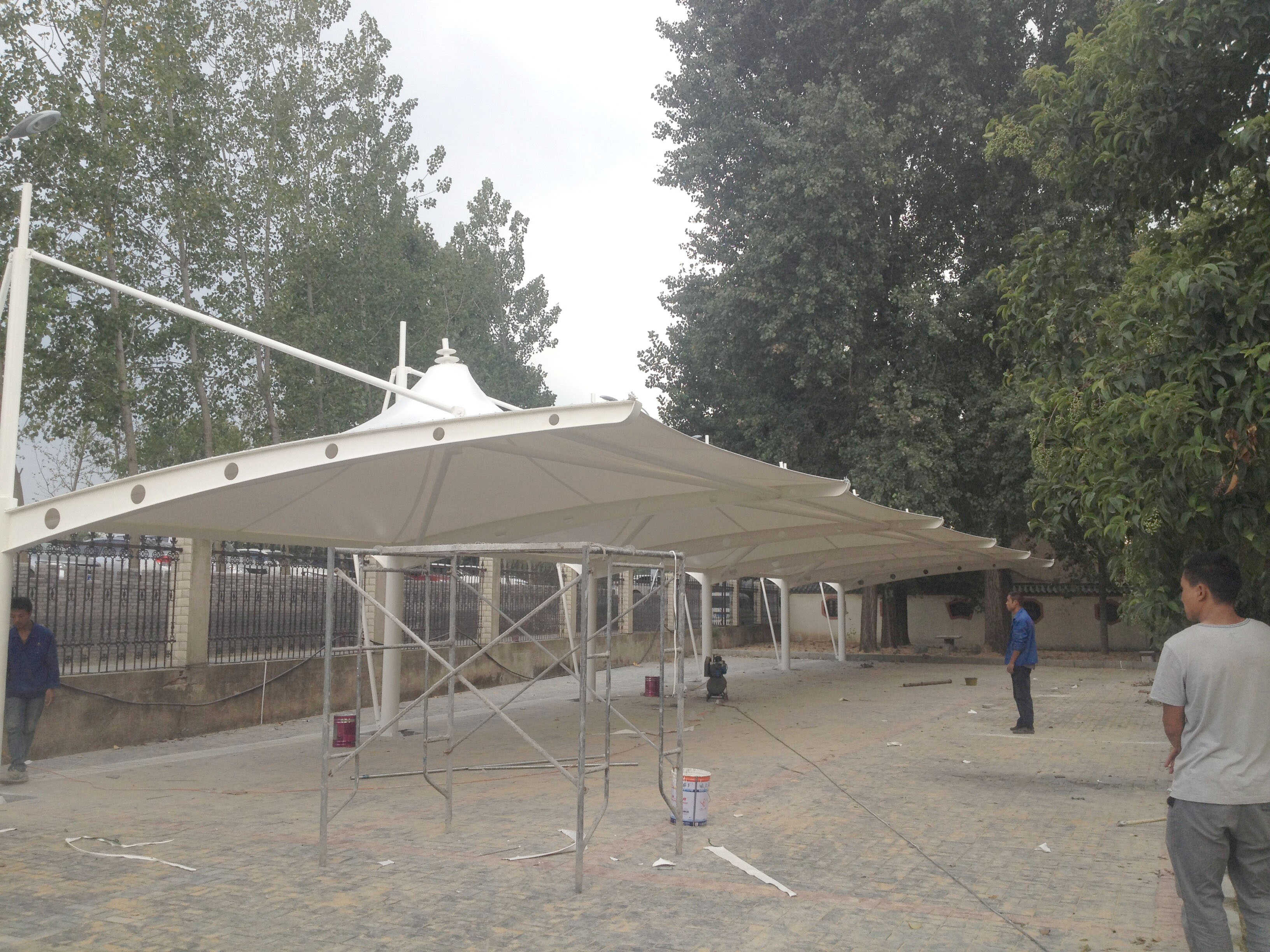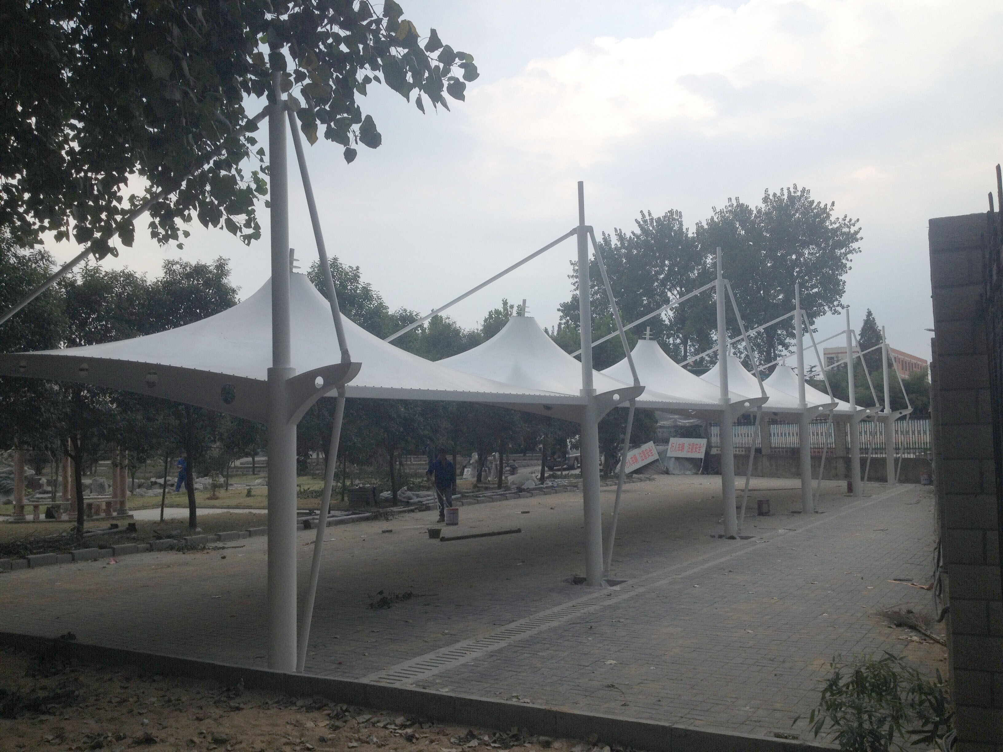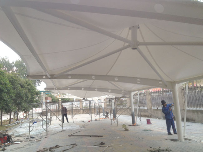 新沂瓦窯中學冒頂車棚尺寸為28.5*6,間距5.7米,面料采用賽德樂s1000-II膜材,膜材的壽命及使用保障國產膜材為15-30年。冒頂車棚根據(jù)施工現(xiàn)場作業(yè)和技術要求本廠采用德國塞德樂s1100-II(白色),和Q235熱鍍鋅高強度優(yōu)質鋼材及其他精品配件精加工制作成品。安裝細節(jié):主體為鋼構焊接,采用主框架與部分結構同步安裝施工,油漆現(xiàn)場作業(yè)完成。膜布廠內加工成品現(xiàn)場安裝細節(jié)處理。需膜結構車棚可以咨詢我司,詳情電話:4008-613-119(客服熱線)