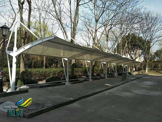 上海松江外國語學(xué)校膜結(jié)構(gòu)車棚的材料很特殊,因此它的造型也十分的獨(dú)特,可以變幻成各種吸引人的視覺效果,十分漂亮。