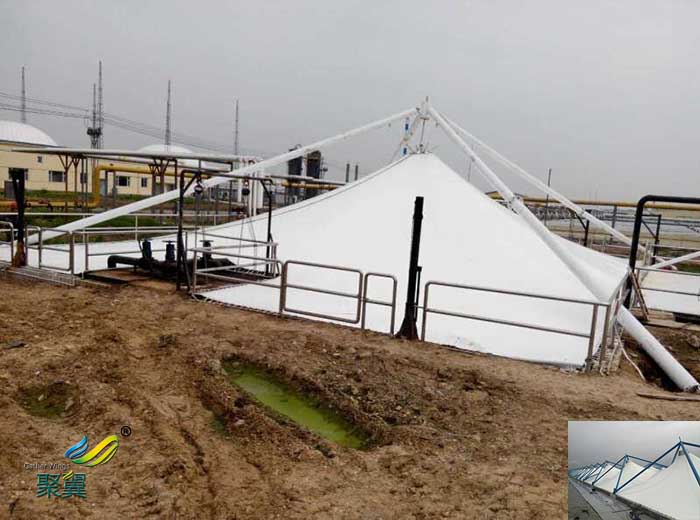 對污水池進行加蓋設計的時候,首先,要確定池體的大小,因為池體的大小將決定后期加多大尺寸的膜材,如果膜材裁剪過大或者過小對污水池內廢氣的收集都是不合理的,而且造成資源的浪費。