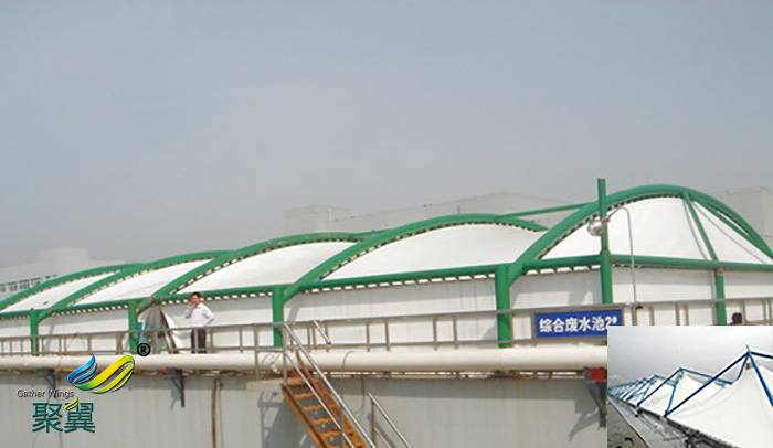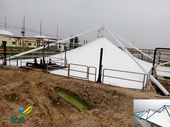 污水池蓋也叫污水池罩、臭氣收集罩。是一種新型的大跨度空間結(jié)構(gòu),越來(lái)越受到用戶的喜愛(ài)和使用,污水池加蓋是由具有優(yōu)良性能的織物(膜材)通過(guò)支撐構(gòu)件(如剛性梁、柱、柔性索),或給膜內(nèi)空氣加壓以一定的方式組合并施加適當(dāng)?shù)某跏碱A(yù)張力而形成具有一定剛度的空間結(jié)構(gòu)形狀,從而承受一定外荷載的一種空間結(jié)構(gòu)形式。而膜材料是大跨度空間結(jié)構(gòu)最重要的組成部分,被稱為“第五代建材”。具有耐腐阻燃,堅(jiān)固防滑、質(zhì)量輕、易安裝、免維護(hù)、絕緣等優(yōu)異特性。