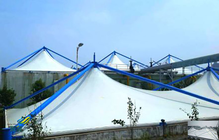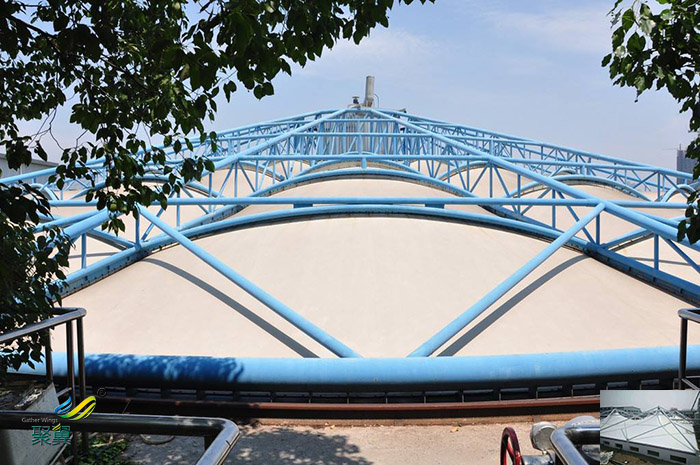 首先,污水池反吊膜加蓋使用的膜材是一種環(huán)境專用膜材,這種膜材抗腐蝕能力很強(qiáng),而且結(jié)構(gòu)新穎,采用鋼結(jié)構(gòu)在外將膜材反吊的形式,避免了鋼結(jié)構(gòu)被池內(nèi)廢氣腐蝕的現(xiàn)象,是傳統(tǒng)結(jié)構(gòu)建筑的弊端,也是區(qū)別于傳統(tǒng)結(jié)構(gòu)建筑的最大特點優(yōu)勢。