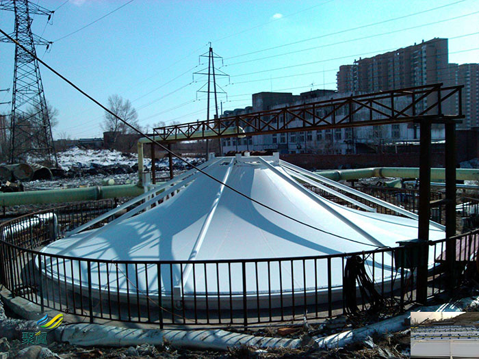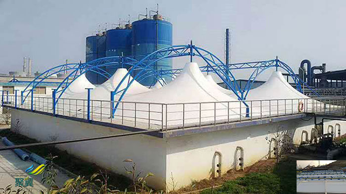 隨著廢氣成分的復(fù)雜多變,加蓋的方式也得到升級。當下市場常用的效果不錯的是反吊膜結(jié)構(gòu)加蓋,這種加蓋方式采用鋼構(gòu)在外面懸吊,不與池內(nèi)酸堿氣體接觸,從根本上解決鋼構(gòu)被腐蝕的現(xiàn)象,從而形成獨具特色的廢氣收集方案,在業(yè)界受到廣泛推崇。這種膜加蓋的方式比傳統(tǒng)的加蓋方式收集廢氣效果更好,而且保證廢氣達到排放標準。不僅膜材具有抗腐蝕特性,而且加蓋方式新穎,造型多變,可以根據(jù)客戶的實際需求和池體的結(jié)構(gòu)形式隨意設(shè)計,造型美觀。在使用年限方面,膜結(jié)構(gòu)加蓋膜材質(zhì)保15年,鋼構(gòu)在50年,將反吊膜結(jié)構(gòu)的優(yōu)勢最大化展現(xiàn)。