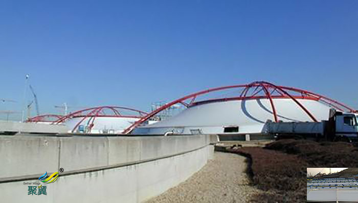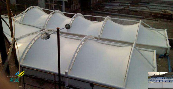 3.污水池加蓋具有高強度低紗聚酯絲;這種特性很好的保證了膜材的抗拉性能,不容易被撕裂,而且耐磨損,氣密性好等特點。