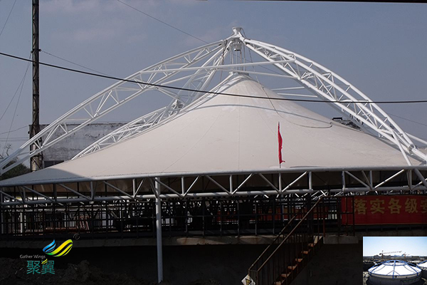 3.污水池加蓋具有高強度低紗聚酯絲;這種特性很好的保證了膜材的抗拉性能,不容易被撕裂,而且耐磨損,氣密性好等特點。