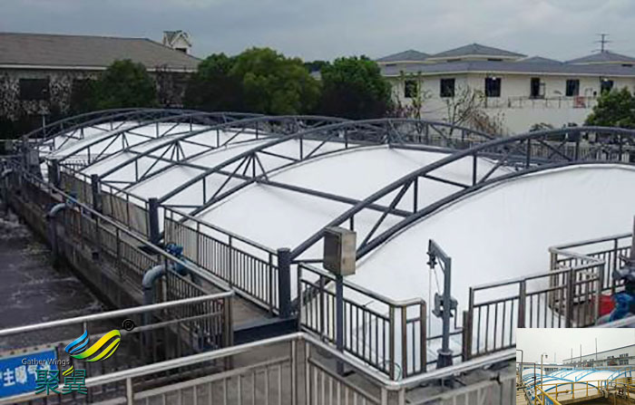 2、防腐效果好;由于膜材料結(jié)構(gòu)建筑的特殊性,可將鋼架設(shè)在外面,只有膜材料結(jié)構(gòu)接觸污水池,基本解決腐蝕問題,而且將來也不用考慮保養(yǎng)問題。