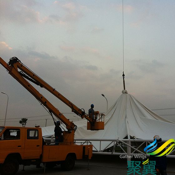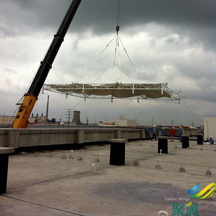 屋頂膜面吊裝是由基本可移動框架和篷布組成,框架一般以鋁合金型材和鋼材為主要部件組成,屋頂膜面的幾何尺寸檢查必須在廠里拼接完成.