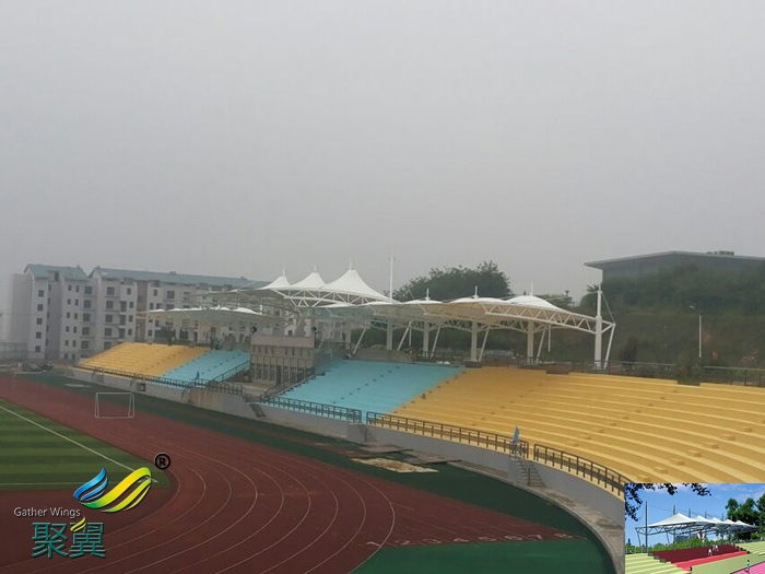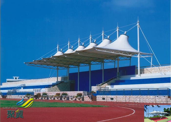 2、膜結(jié)構(gòu)體育看臺具有質(zhì)輕、強(qiáng)度高、跨度大、耐腐、耐高溫、防震、無二次污染、自潔性等優(yōu)點(diǎn)這對學(xué)校衛(wèi)生的要求。