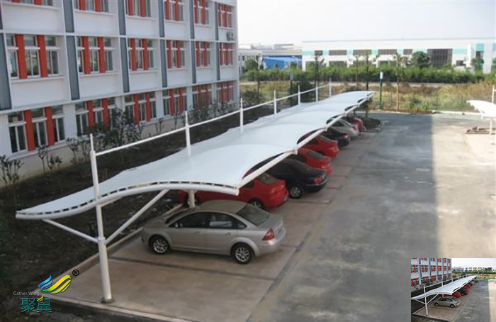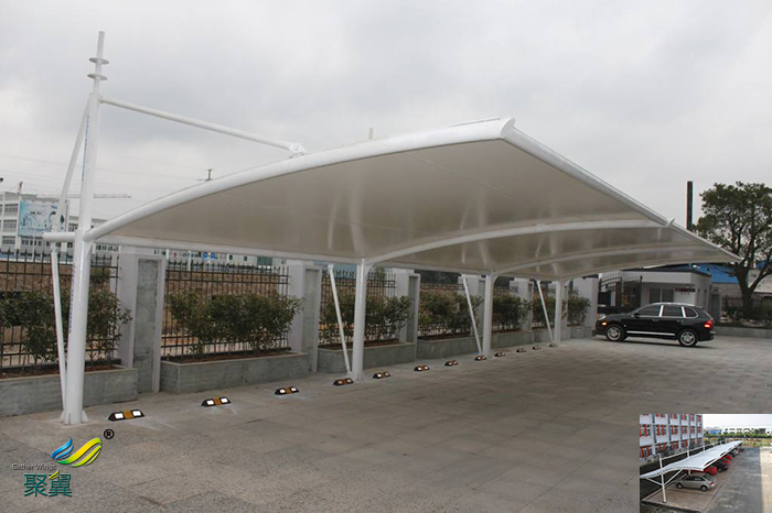 膜結(jié)構(gòu)車棚一種作為屏障,用來保護(hù)車輛不受損傷的一種建筑,主要起到擋風(fēng)遮雨的功能,還有膜結(jié)構(gòu)車棚也是一件難得藝術(shù)品。