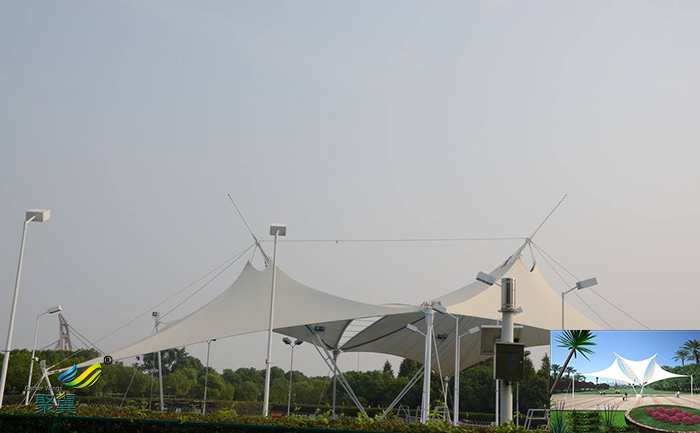 三點,景觀膜結(jié)構(gòu)施工周期短。膜片的裁剪制造、鋼索和鋼結(jié)構(gòu)的制造均在工廠內(nèi)完結(jié),景觀膜結(jié)構(gòu)在施工現(xiàn)場僅僅鋼索、鋼結(jié)構(gòu)及膜片的銜接安裝及張拉的進程,因此在現(xiàn)場的施工安裝比較方便且安全。