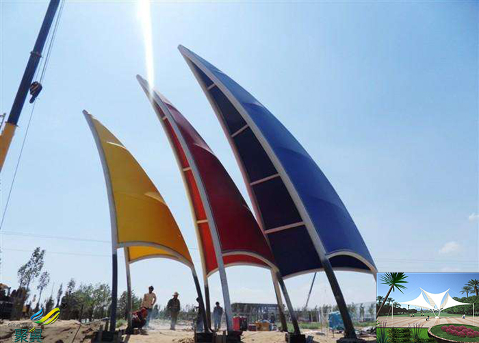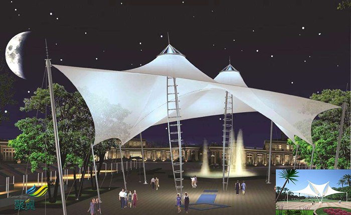 2、張拉景觀膜結(jié)構(gòu)對于同等大小的建筑,如果采用膜結(jié)構(gòu),其成本只相當(dāng)于傳統(tǒng)建筑的二分之一或更少,特別是在建筑短期應(yīng)用的大跨度建筑時,就更為經(jīng)濟。
