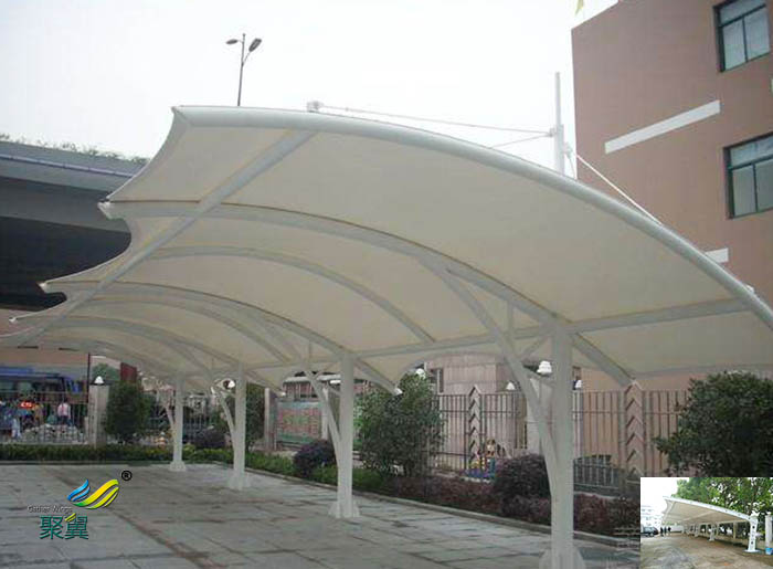 膜結(jié)構(gòu)車棚是近年來在國內(nèi)開始流行的一種新式的車棚結(jié)構(gòu)。它與以往的舊式車棚相比,結(jié)構(gòu)更加輕盈,而且在使用中比較穩(wěn)固。它的材料使用了高分子膜結(jié)構(gòu)材料和支撐構(gòu)件共同組成,并且能根據(jù)支撐構(gòu)件的高低位置不同而呈現(xiàn)不同的形狀。因此在教育,商業(yè),體育館等公共場所都有很廣泛的應(yīng)用車棚在最初是作為一種能提供給車輛停泊的地方,使車輛避免了直接面對風(fēng)吹雨打。用來保證自行車,汽車等在車棚下不受損傷。