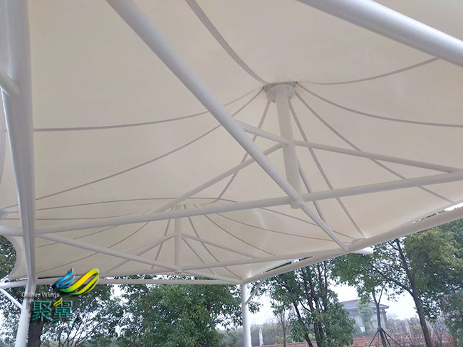 不僅為人們提供遮陽避雨的空間。同時(shí),更因?yàn)榻鹕教飯@山莊景觀膜結(jié)構(gòu)工程這種生動(dòng)活潑的造型能給人們帶來時(shí)尚、輕松的休閑感受,所以廣受迎接。