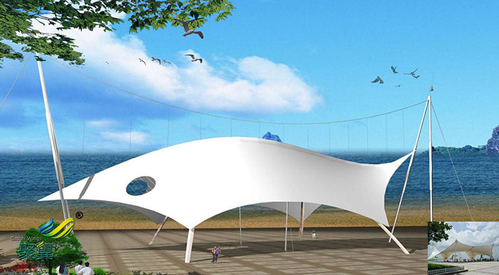 景觀膜結(jié)構(gòu)的獨(dú)特曲面外形使其具有強(qiáng)烈的雕塑感.膜面通過張力達(dá)到自平衡.負(fù)高斯膜面高低起伏具有的平衡感使體型較大的結(jié)構(gòu)看上去像擺脫了重力的束縛般輕盈地 雕塑般的質(zhì)感令人激動(dòng),優(yōu)秀的膜結(jié)構(gòu)設(shè)計(jì)是結(jié)構(gòu)與外形的有機(jī)融合,使其顯得了類拔萃,同時(shí)與自然環(huán)境、歷史及現(xiàn)代的城市景觀有機(jī)結(jié)合.輕型結(jié)構(gòu)可以看成是大型的雕塑作品,可為其周邊空間增添活力,成為周圍環(huán)境的補(bǔ)充和焦點(diǎn).利用膜材的透光性和反射性,經(jīng)過設(shè)計(jì)的人工燈光也可使膜結(jié)構(gòu)成為光的雕塑.