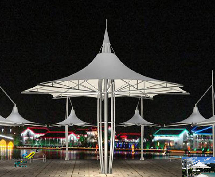 張拉膜結(jié)構(gòu)是指通過(guò)拉索將膜材料張拉于結(jié)構(gòu)上而形成的,張拉膜結(jié)構(gòu)也可稱為張拉式索膜結(jié)構(gòu),是由穩(wěn)定的空間雙曲張拉膜面、支承桅桿體系、支承索和邊緣索等構(gòu)成的結(jié)構(gòu)體系。張拉膜結(jié)構(gòu)由于具有形象的可塑性和結(jié)構(gòu)方式的高度靈活性、適應(yīng)性,所以此種方式的應(yīng)用極其廣泛。張拉膜結(jié)構(gòu)又可分為索網(wǎng)式、脊索式等。張拉膜結(jié)構(gòu)體系富于表現(xiàn)力、結(jié)構(gòu)性能強(qiáng),但造價(jià)稍高,施工要求也高。