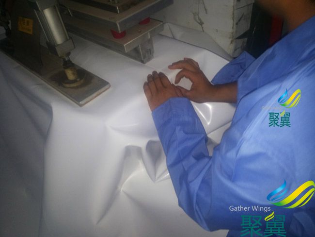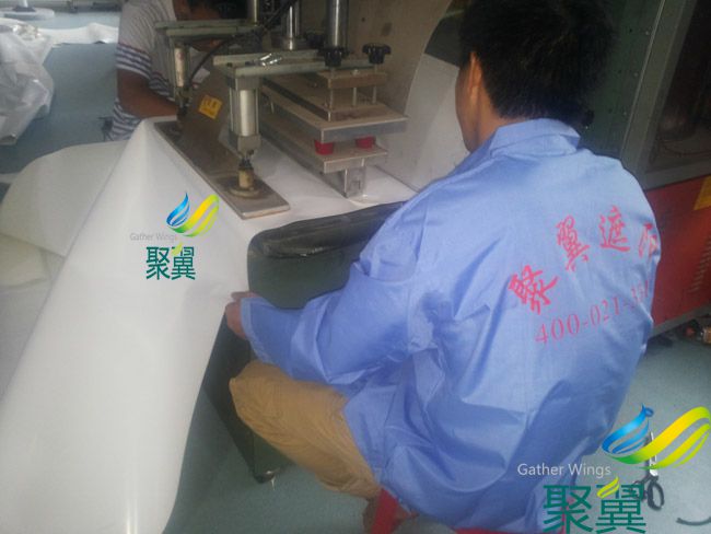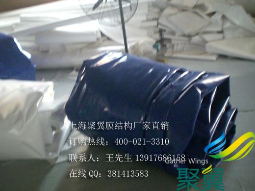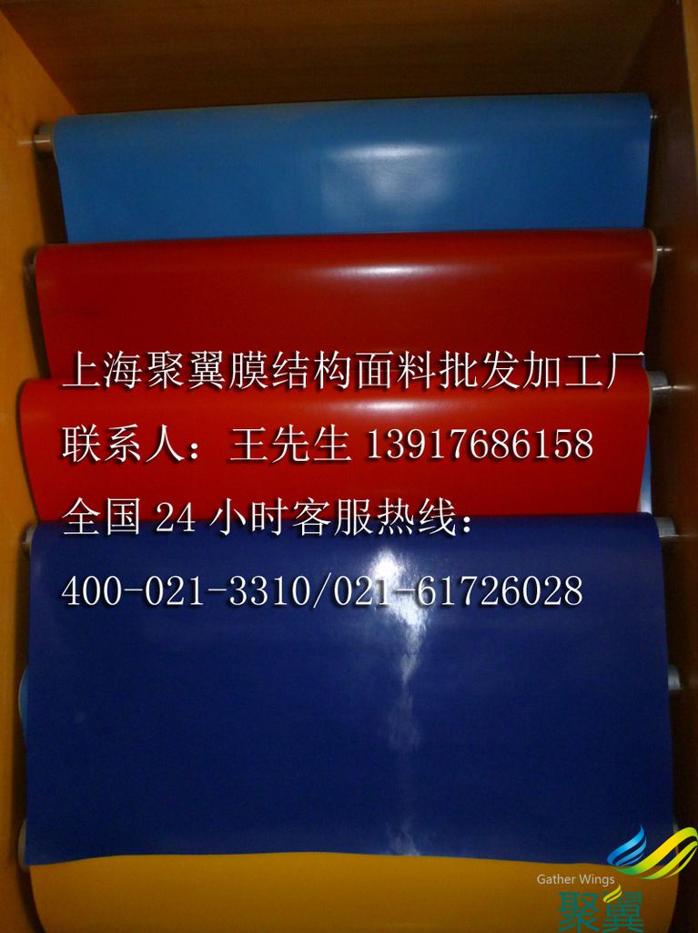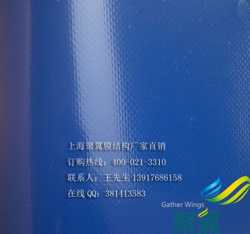 聚翼PVC藍色膜布:門幅2060mm,每卷50米。2000米以上可定做任何色系! 膜布的門幅有2.5\3.0\3.5等根據(jù)不同膜布造型選擇最節(jié)省膜布的設(shè)計裁剪圖,減小損耗降低成本,方便安裝縮減膜結(jié)構(gòu)的制作工期!之后轉(zhuǎn)交膜布裁剪部依裁剪圖精確剪裁所需膜布形狀大小后,送交焊接部焊接制作,經(jīng)過高頻熱合機焊接成型后送檢測部,經(jīng)檢測合格后送交包裝部打包,制作完成后發(fā)貨,安裝!