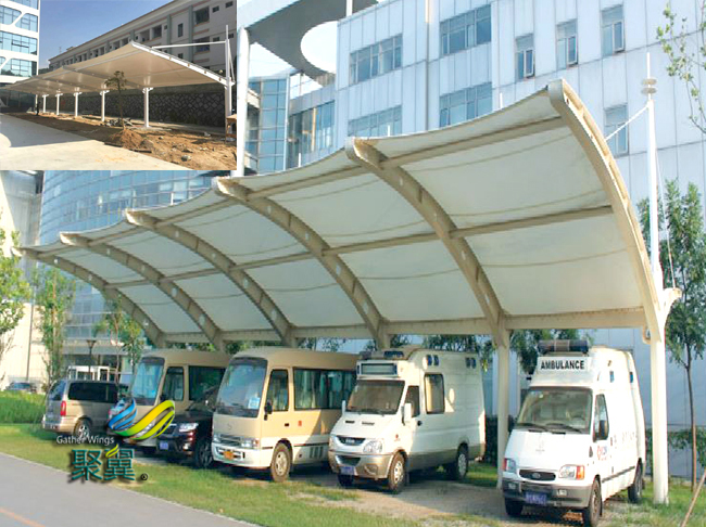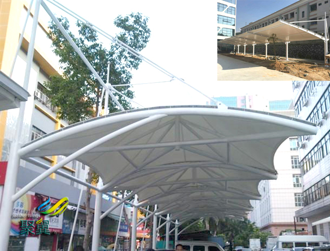 膜結(jié)構(gòu)車棚適用高強(qiáng)度柔性薄膜材料經(jīng)受其它材料的拉壓作用而形成的穩(wěn)定曲面,能承受一定外荷載的空間結(jié)構(gòu)形式。膜結(jié)構(gòu)車棚造型自由、輕巧、柔美,充滿力量感,阻燃、制作簡(jiǎn)易、安裝快捷、節(jié)能、易于、使用安全等優(yōu)點(diǎn),因而使它在世界各地受到廣泛應(yīng)用。