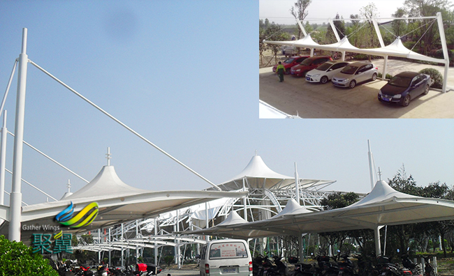 景觀膜結(jié)構(gòu)車棚工程能提供豐富多彩的用途,并與園林景觀融為一體。創(chuàng)造出讓人們盡情享受的快樂空間。充分展示了膜結(jié)構(gòu)車棚清晰受力的藝術(shù)之美,膜結(jié)構(gòu)車棚巧妙的整合周圍的環(huán)境,給人們一種高貴典雅、浪漫溫馨之感。另外由于膜結(jié)構(gòu)車棚膜材料本身特有的顯色性,在夜間彩燈的映射下能形成絢麗繽紛的景觀。
