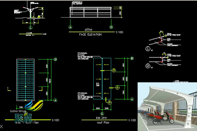 這些方法都能改善膜結構車棚PVc膜材料的自潔性,特別是在表面粘貼PVF薄膜(氟化乙烯)能大大改善膜材料的自清性及抗老化性。