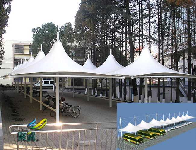 膜結(jié)構(gòu)車(chē)棚施加預(yù)應(yīng)力能使整體空間結(jié)構(gòu)體系得以協(xié)同工作;使體系得以覆蓋大面積、大跨度無(wú)自由空間;使體系得以抵抗狂風(fēng)、大雪等極不利荷載狀況;使膜結(jié)構(gòu)車(chē)棚膜體減少磨損、延長(zhǎng)使用壽命,成為永久建筑等等。