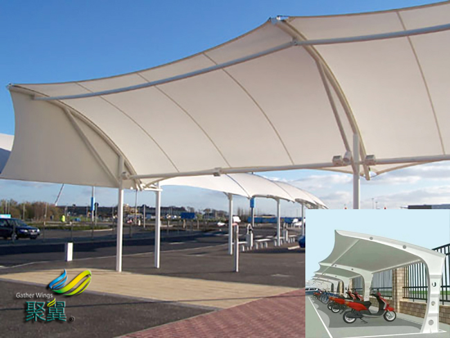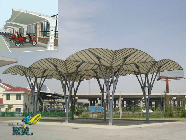 施加膜結(jié)構(gòu)車(chē)棚預(yù)張力時(shí)應(yīng)以施力點(diǎn)位移達(dá)到設(shè)計(jì)值為控制標(biāo)準(zhǔn),位移允許偏差為±10%。對(duì)有代表性的施力點(diǎn)還應(yīng)進(jìn)行力值抽檢,力值是允許的偏差是為±10%。是應(yīng)由設(shè)計(jì)的單位是及施工單位共同選定有代表性的施力點(diǎn)。