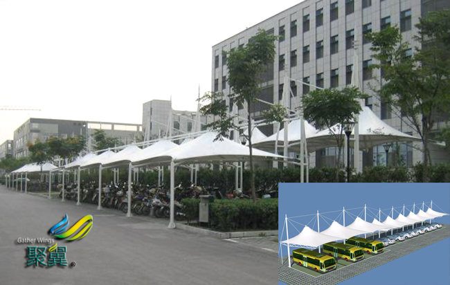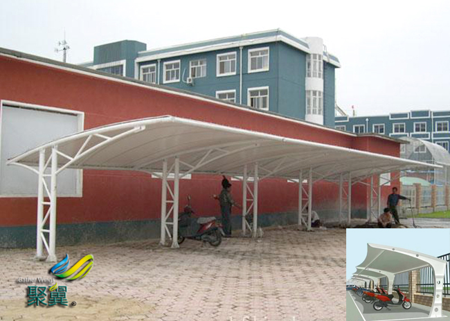 膜結(jié)構(gòu)車(chē)棚所用的原料有很多,主要原材料是膜材料,目前建筑膜材廣泛認(rèn)可的標(biāo)準(zhǔn)是日本JISA-93所規(guī)定的A(PTFE)、B、C三類(lèi),是根據(jù)其防火性能的優(yōu)劣來(lái)劃分的。但是在施工中我們需要根據(jù)用戶(hù)的選擇來(lái)決定選擇哪種質(zhì)量的膜結(jié)構(gòu)車(chē)棚膜材料,但該棚是出自美國(guó)Weidlinger公司設(shè)計(jì)制作,由此也可以看出中國(guó)在該領(lǐng)域與國(guó)外先進(jìn)國(guó)家的差距很大。